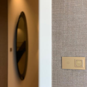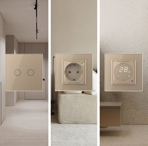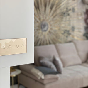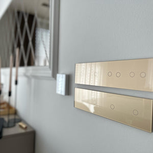 Met de luxe gouden glasplaat van Livolo bedient u moeiteloos zowel uw verlichting als uw thermostaat. Een slimme en elegante oplossing voor ultiem comfort in huis.