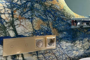 Deze gouden Livolo combinatie met schakelaars, een Bluetooth inbouwspeaker en een stopcontact met klapdeksel biedt stijl en functionaliteit in de badkamer. Geniet van comfort met een vleugje luxe.