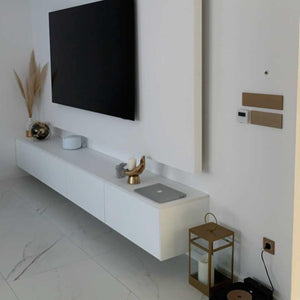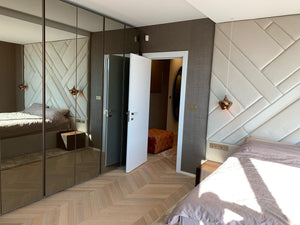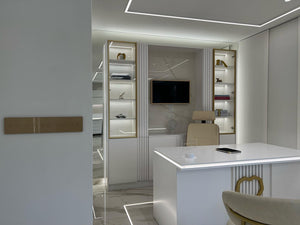 De gouden schakelaars en stopcontacten van Livolo voegen een elegante touch toe aan deze luxe kastenwand. Stijlvol design en perfect gebruiksgemak, van binnenkomst tot nachtrust.