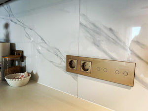 Het gouden schakelmateriaal van Livolo combineert luxe met praktisch gemak. Een elegante glasplaat met geïntegreerde schakelaars en stopcontacten zorgt voor een verfijnde uitstraling in uw keuken.
