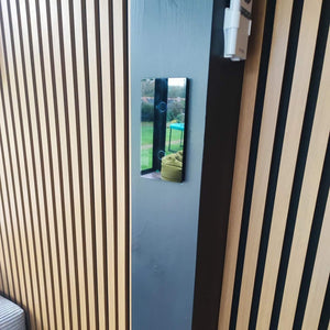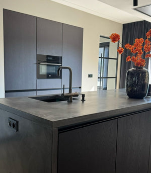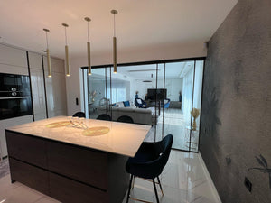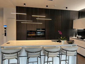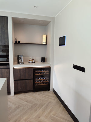 Deze zwarte glazen touch schakelaars met geïntegreerde Bluetooth-speaker aan de zijkant van het kookeiland combineren stijl met functionaliteit. Bedien moeiteloos uw verlichting met een lichte aanraking en geniet van uw favoriete muziek tijdens het koken. Een moderne en luxe toevoeging aan elke keuken.