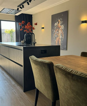 De Livolo dimmer schakelaar in stralend zwart voegt een moderne touch toe aan uw keuken. Deze schakelaar bedient moeiteloos de spotjes onder de kastjes en de hanglamp boven de eettafel, waardoor u de perfecte sfeer kunt creëren voor elke gelegenheid.