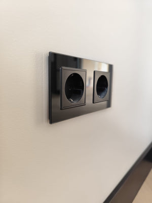 Dit zwarte glazen dubbele stopcontact combineert elegantie met praktische toepassing. Het strakke ontwerp en het heldere glas passen perfect in moderne interieurs, terwijl de robuuste afwerking zorgt voor betrouwbaarheid en duurzaamheid. Een verfijnde keuze voor een luxe uitstraling in uw ruimte.